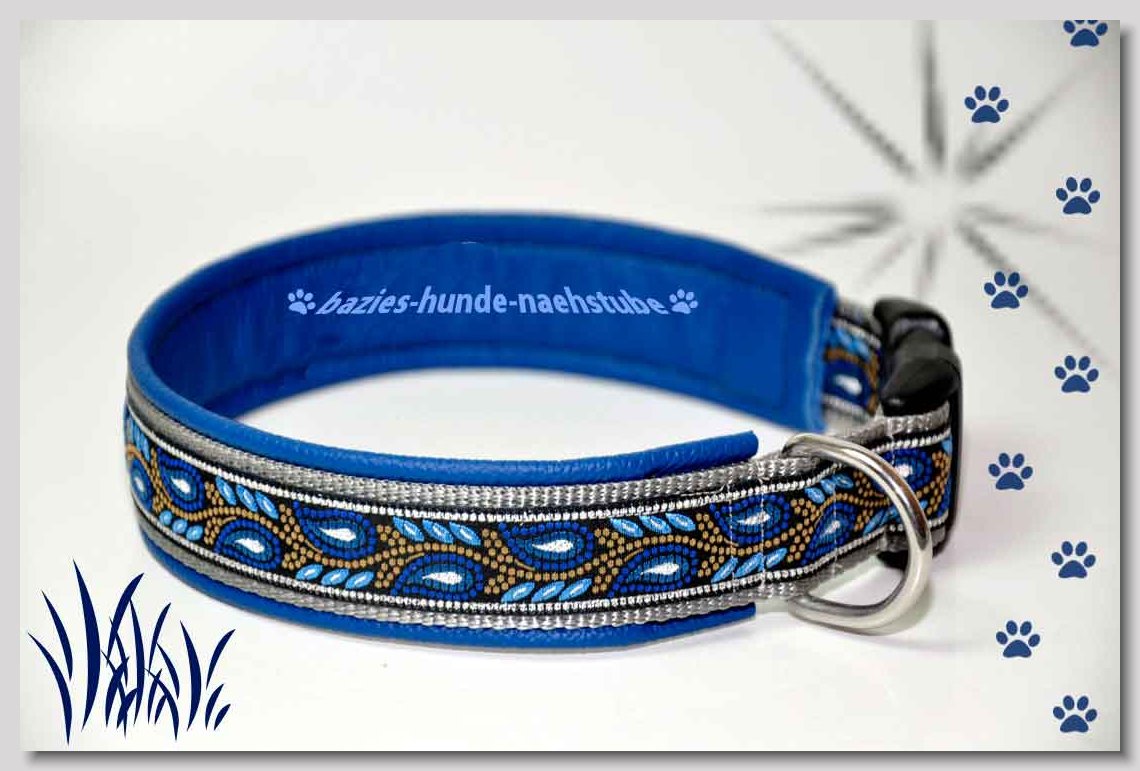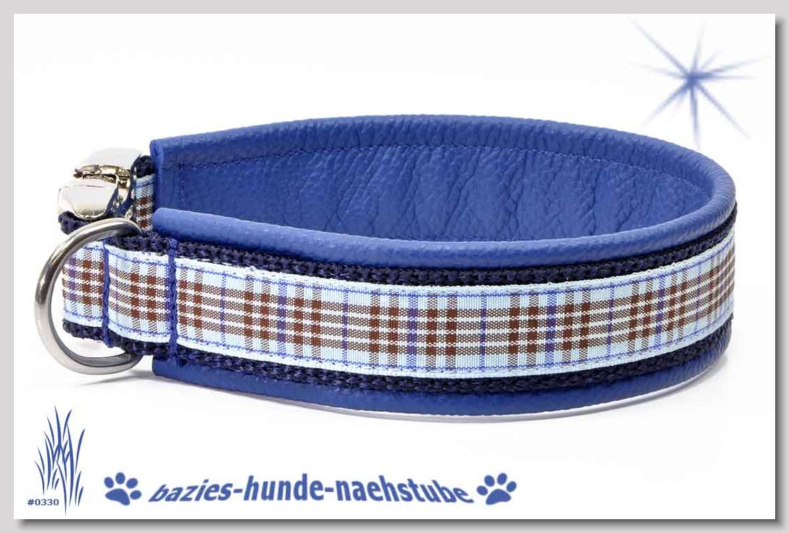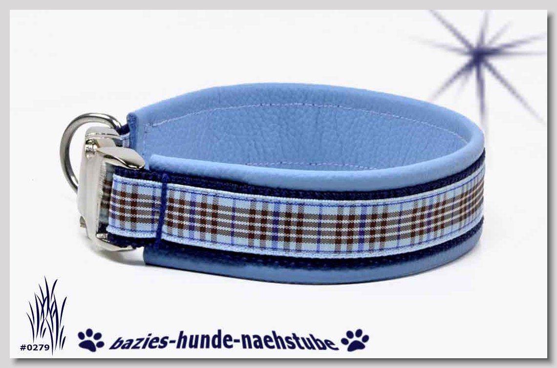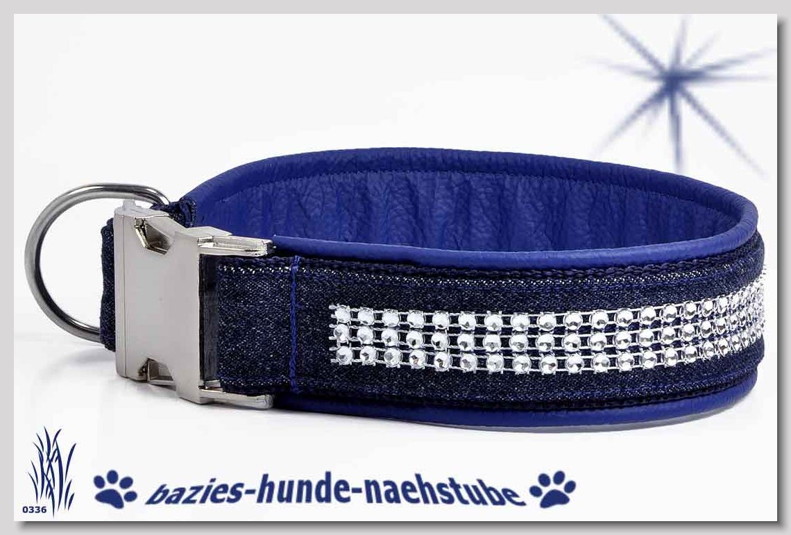 Art.Nr.: S1411-0063 (0329) Halsband im Design "Mach die Fliege" 35mm Gesamtbreite, Webband "Vichy Karo blau" - verziert mit 2 farblich passenden Knöpfen und aufgenähter Jeansfliege, Gurtband gb25-07 marine - zusätzlich Jeansstoff aufgenäht, Leder L16 capriblau, ALU-Steckschliesser
