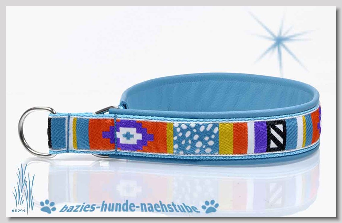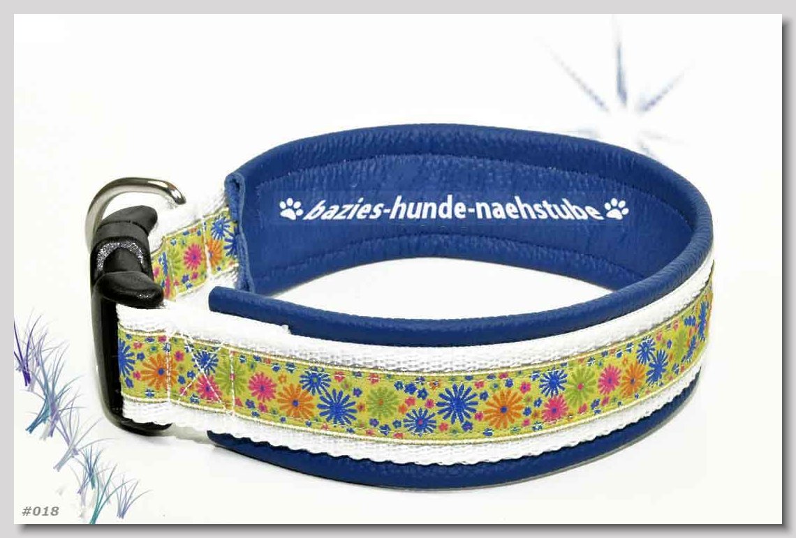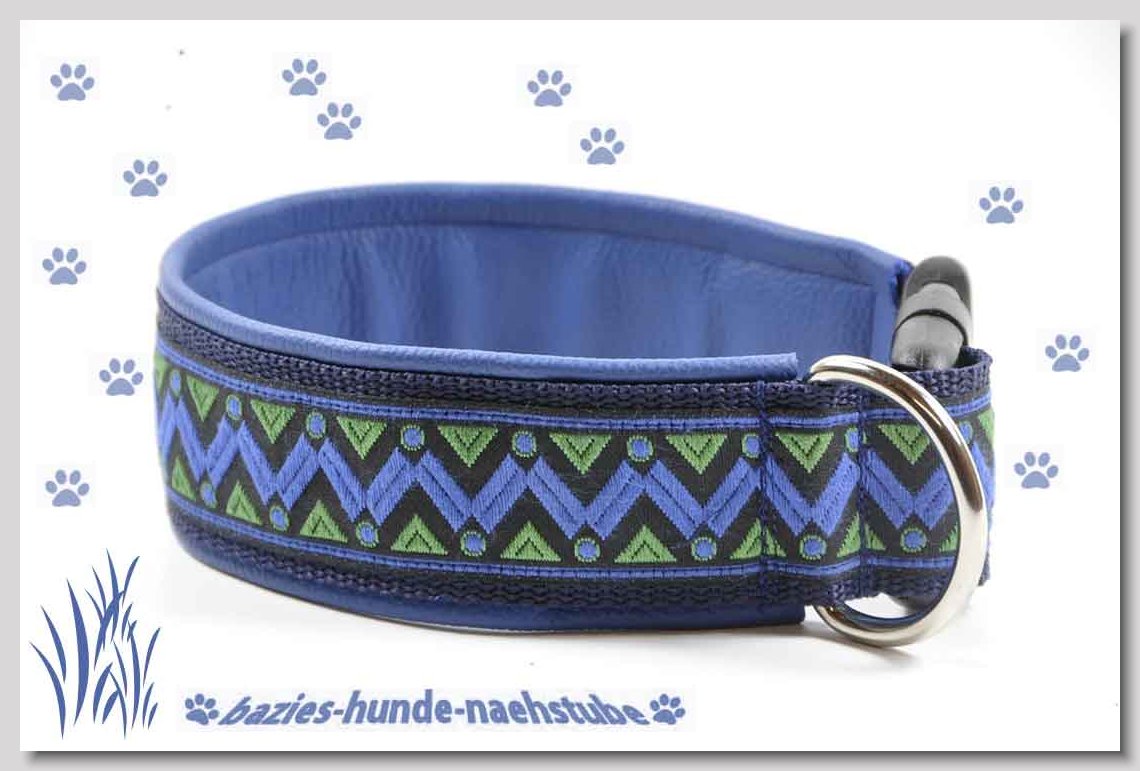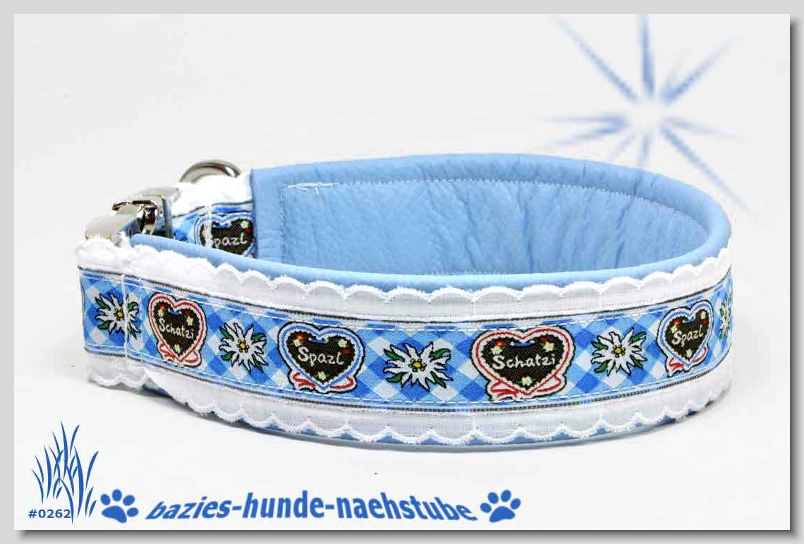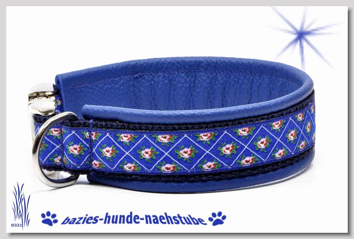 Art.Nr.: S1411-0063 (0329) Halsband im Design "Mach die Fliege" 35mm Gesamtbreite, Webband "Vichy Karo blau" - verziert mit 2 farblich passenden Knöpfen und aufgenähter Jeansfliege, Gurtband gb25-07 marine - zusätzlich Jeansstoff aufgenäht, Leder L16 capriblau, ALU-Steckschliesser