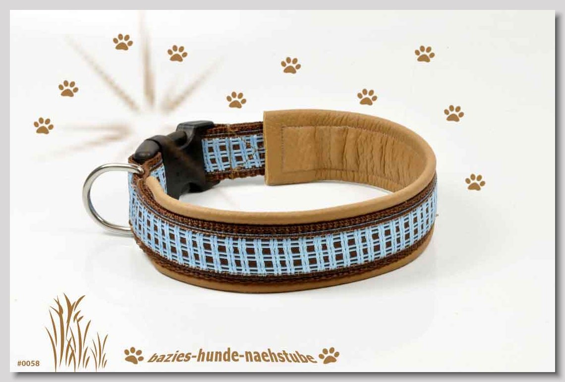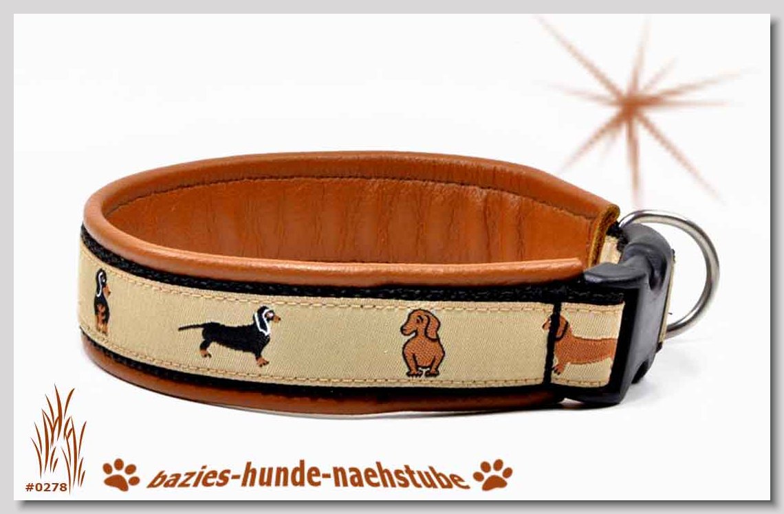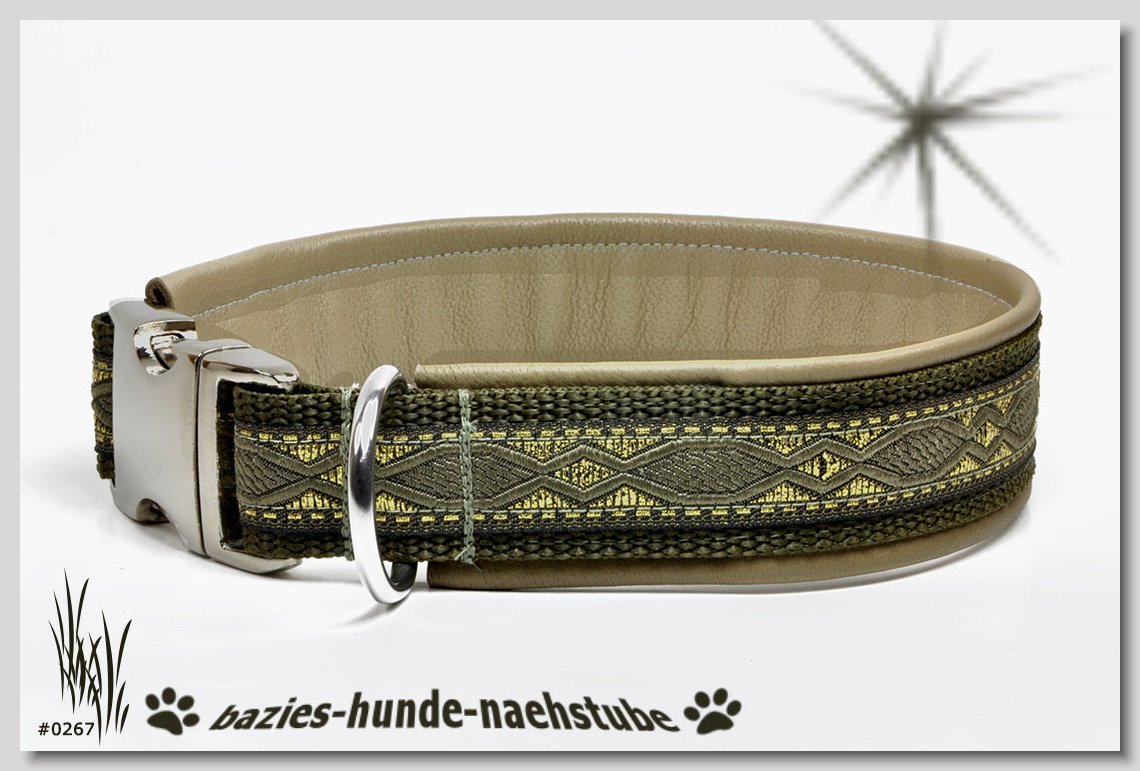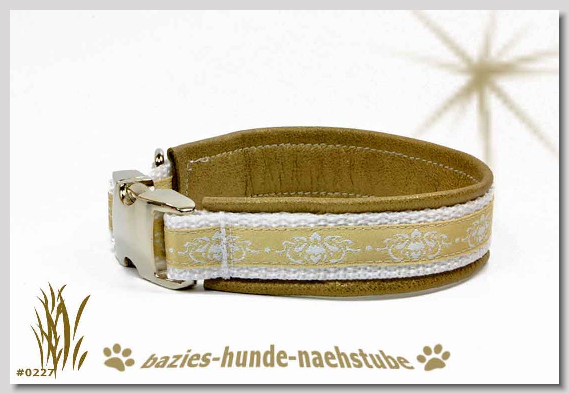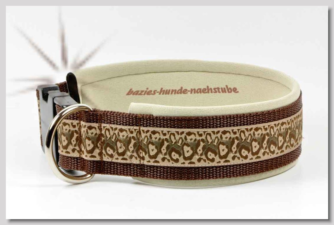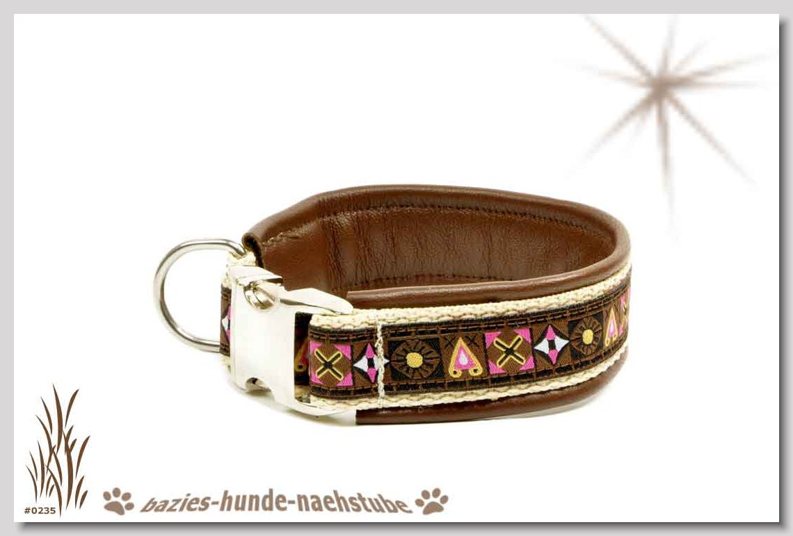 Art.Nr.: S1411-0061 Halsband "Indios beige" 35mm Gesamtbreite Webband wb2-166 Gurtband gb25-13 beige mit aufgenähtem Jeansstoff Leder L21 caramel ALU-Steckschliesser