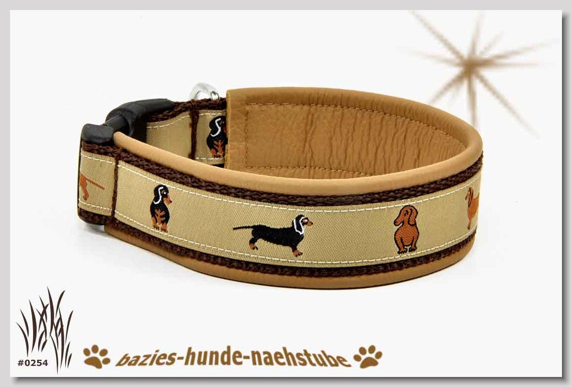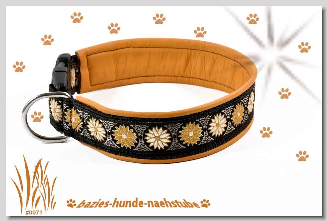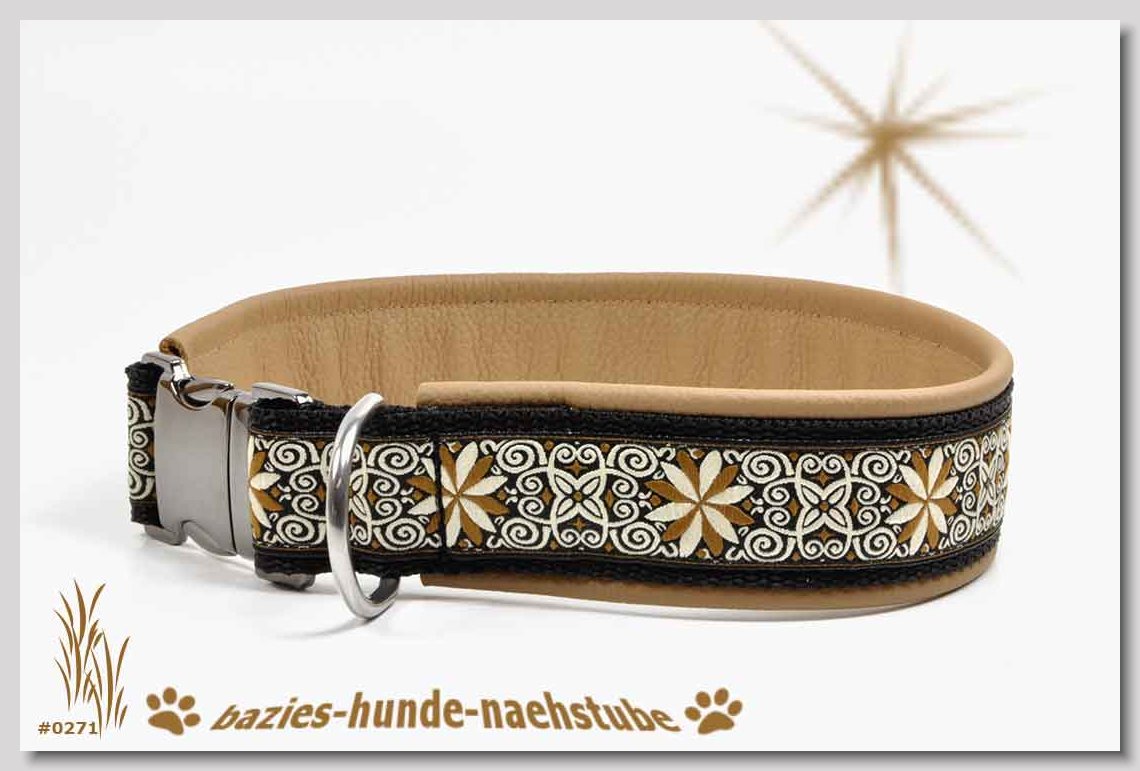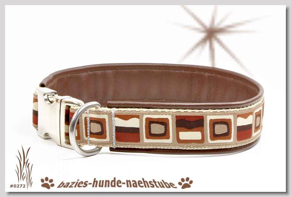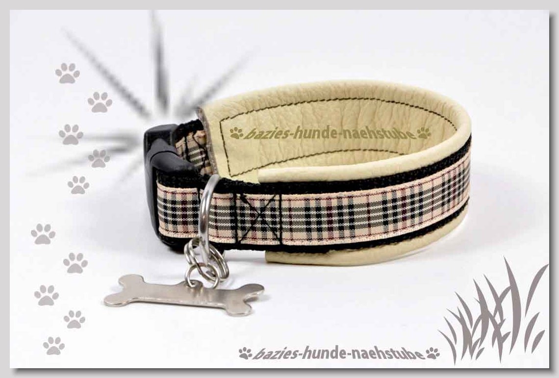 Art.Nr.: S1411-0061 Halsband "Indios beige" 35mm Gesamtbreite Webband wb2-166 Gurtband gb25-13 beige mit aufgenähtem Jeansstoff Leder L21 caramel ALU-Steckschliesser