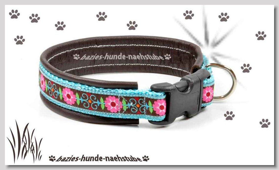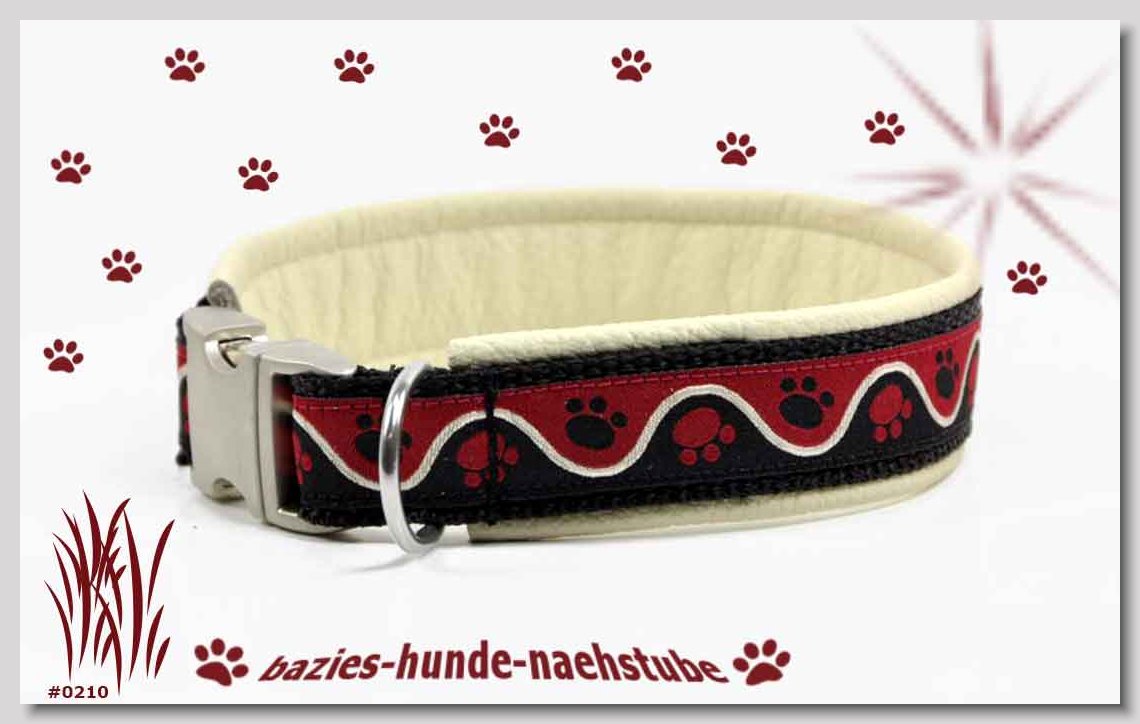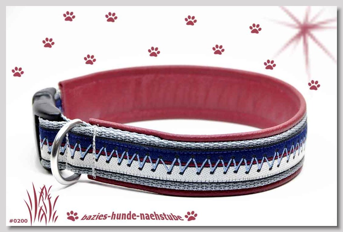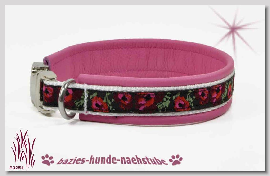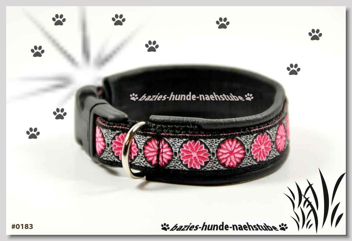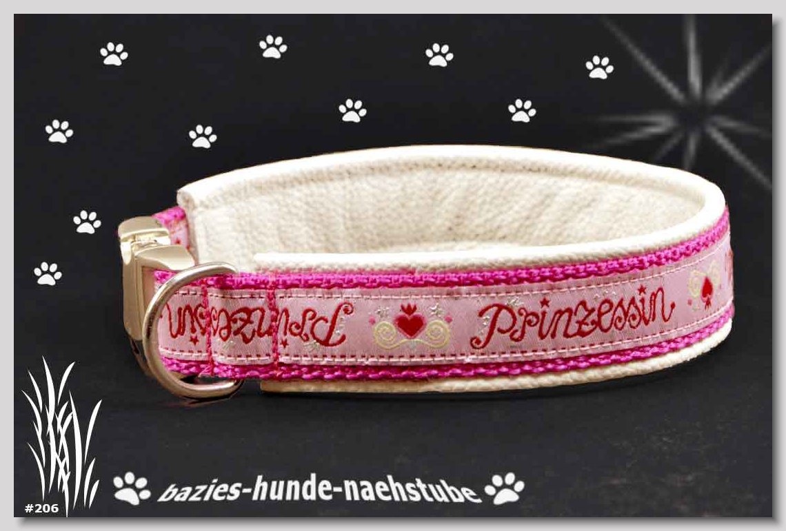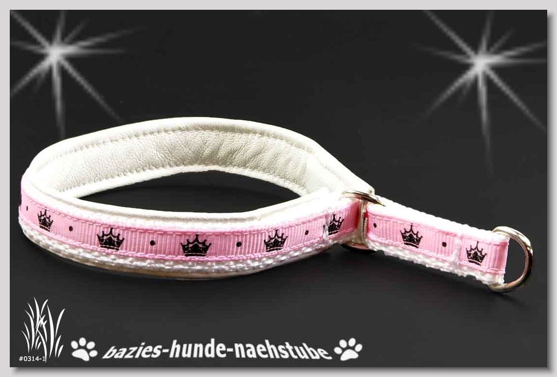 Art.Nr.: S1412-0072 (0332) Halsband im Design "Doggy-Crown pink" 35mm Gesamtbreite Webband wb2-195 Gurtband gb25-10 weiss Leder L07 brombeer Standard-Steckschliesser
