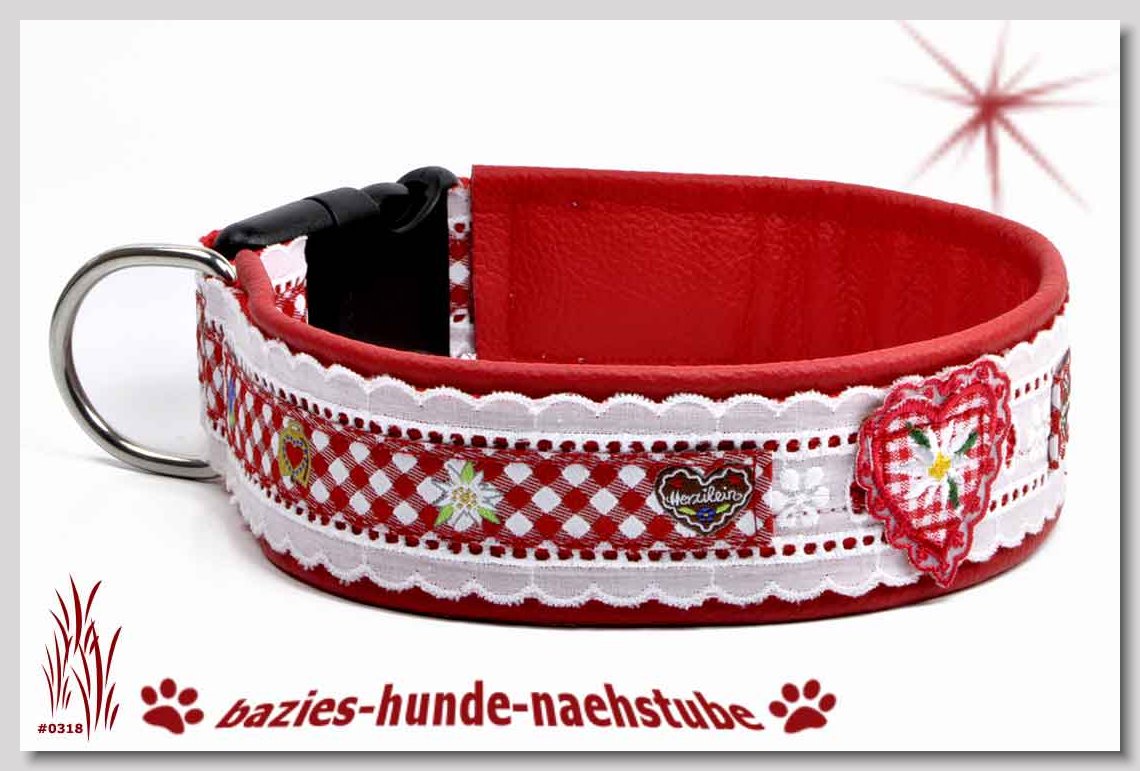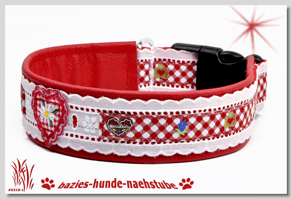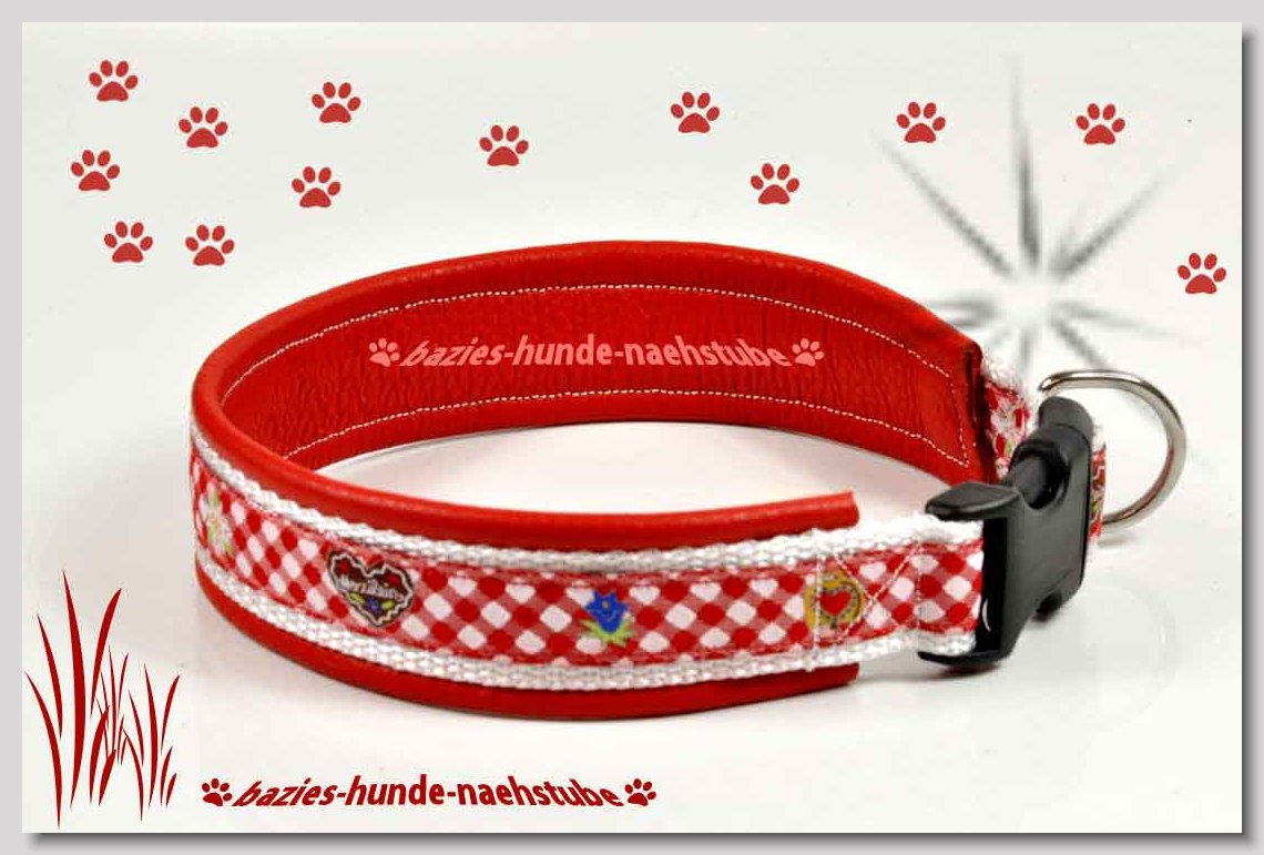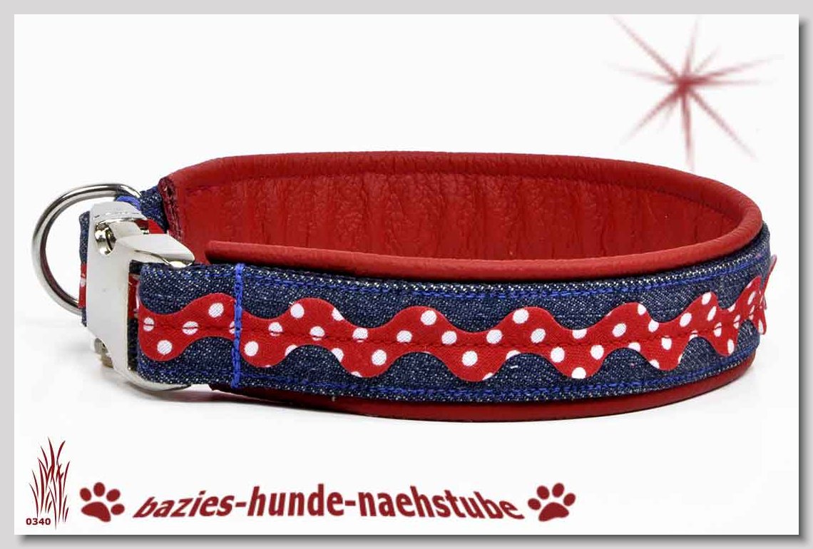 Art.Nr.: S1411-0062 Halsband "Kariert und Geknöpft" rot 35mm Gesamtbreite Webband Vichy Karo rot mit insgesamt 3 aufgenähten Knöpfen Gurtband gb25-07 dunkelblau mit aufgenähtem Jeansstoff Leder L08 rot Standard-Steckschliesser