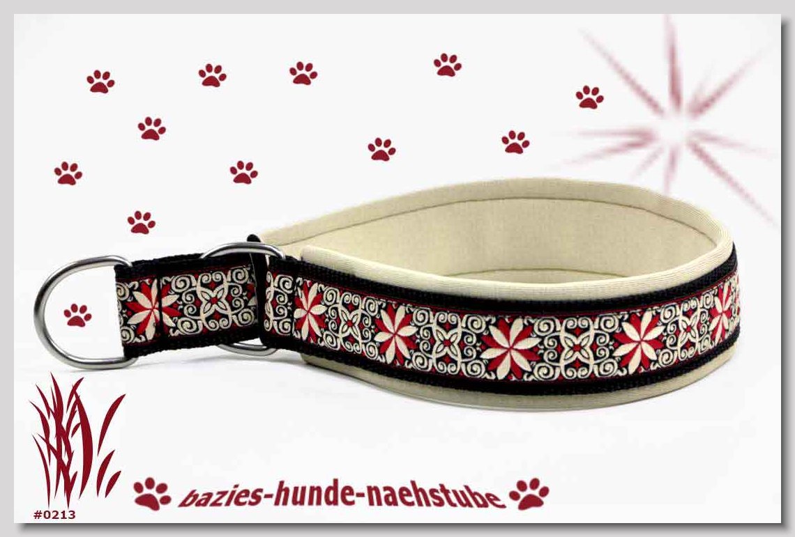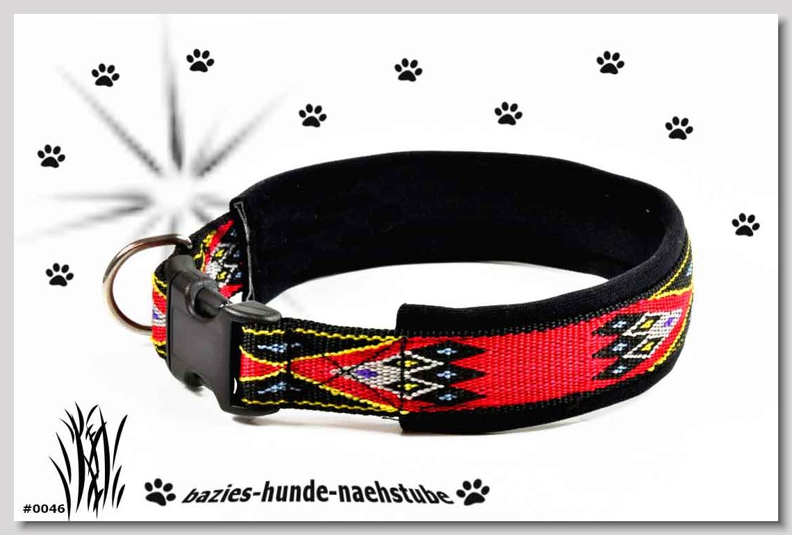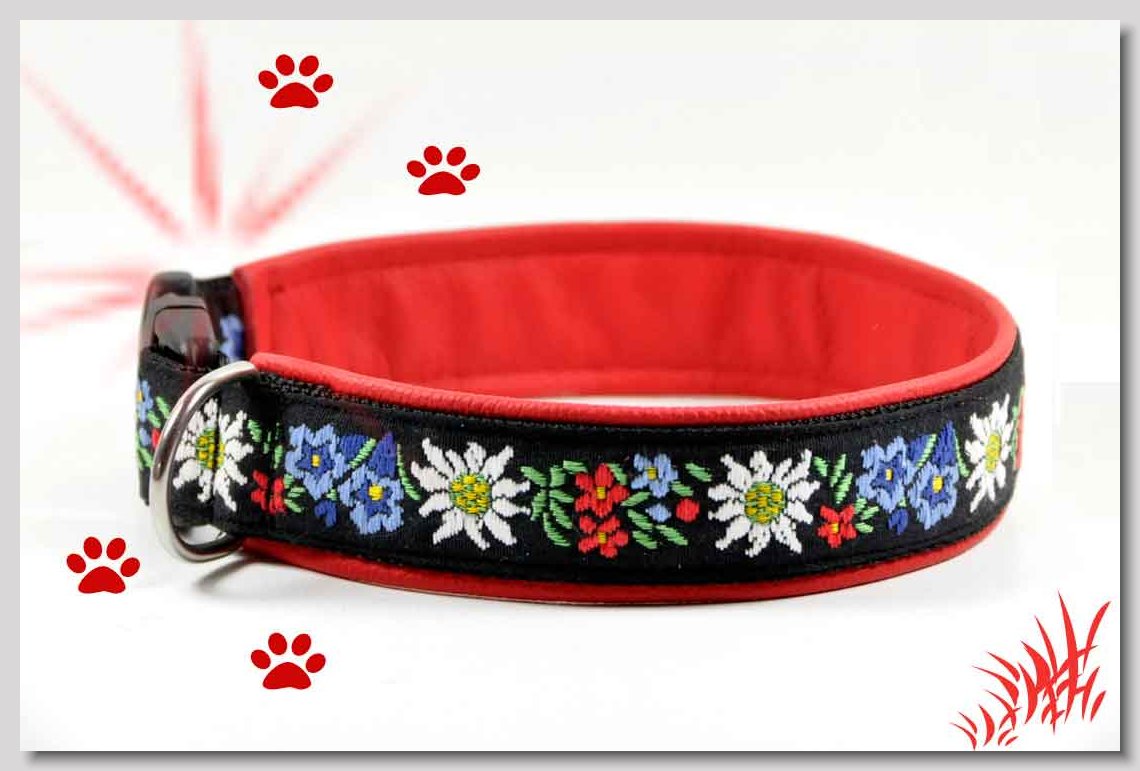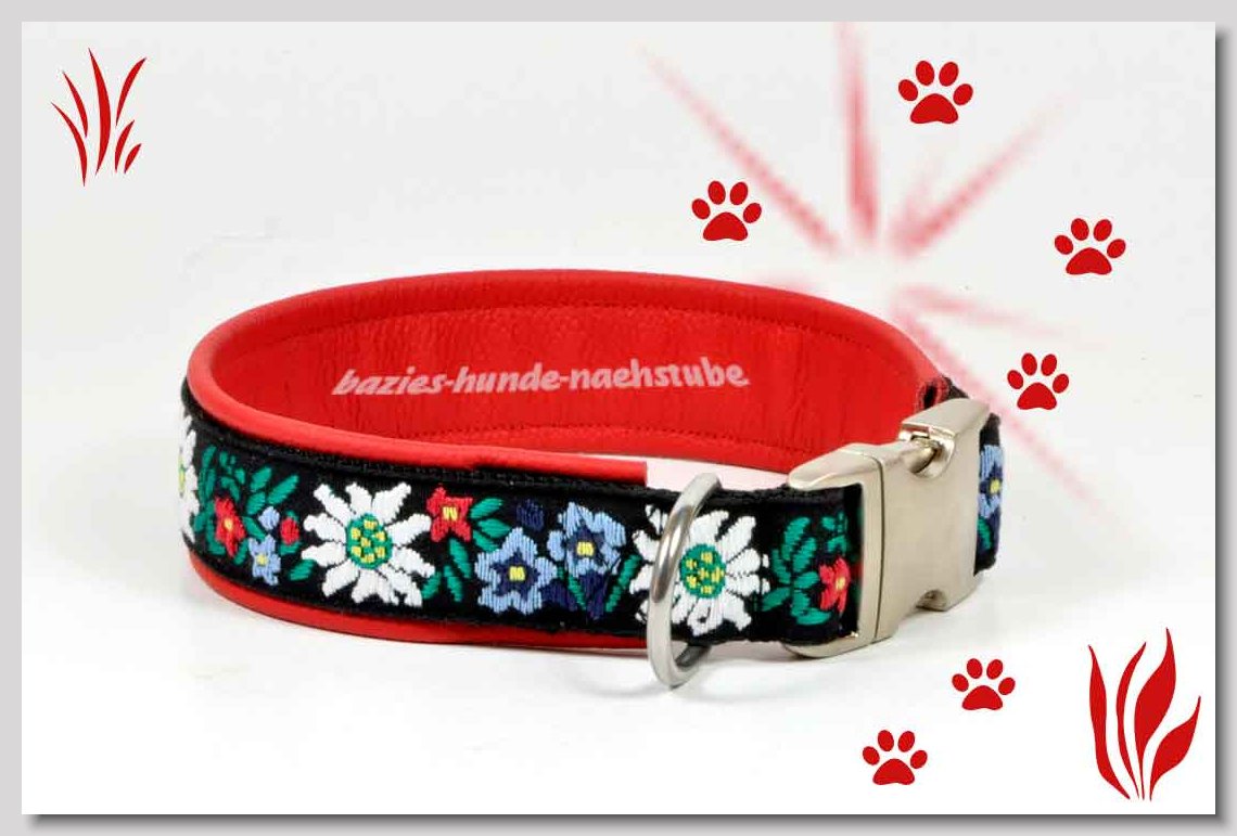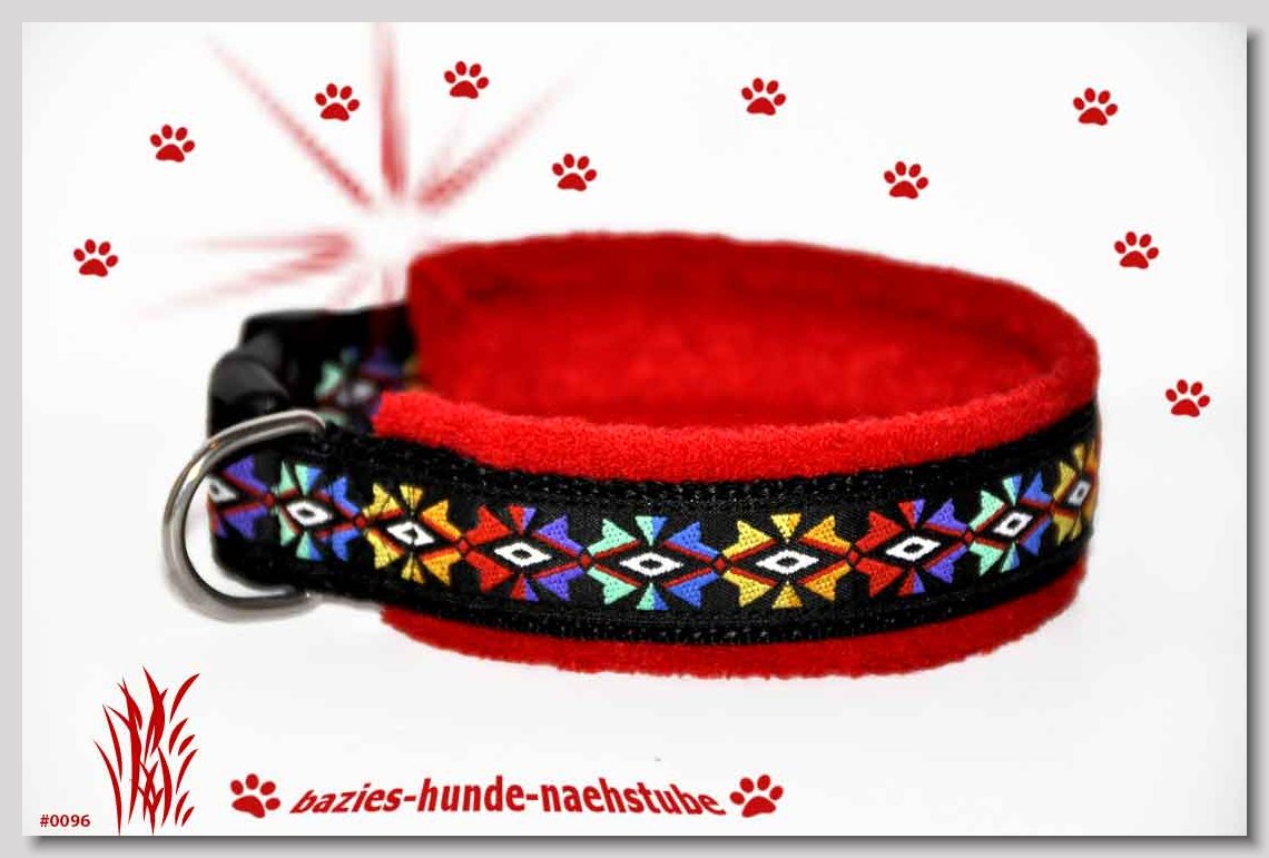 Art.Nr.: S1411-0062 Halsband "Kariert und Geknöpft" rot 35mm Gesamtbreite Webband Vichy Karo rot mit insgesamt 3 aufgenähten Knöpfen Gurtband gb25-07 dunkelblau mit aufgenähtem Jeansstoff Leder L08 rot Standard-Steckschliesser
